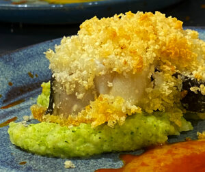 O primeiro prato servido é de salmão grelhado com fettuccine negro e molho de saquê. Já o segundo vem com filé mignon com quinoa e brócolis, crepe de queijo de cabra e geleia de tomate. Ao final é servido um mix de sobremesas e café com miniaturas.