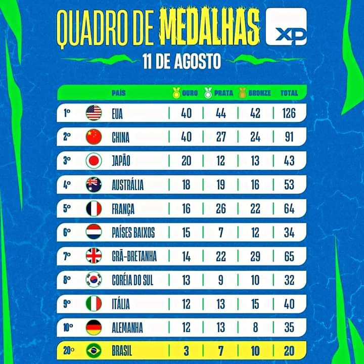 Veja abaixo o quadro final de medalhas em Paris